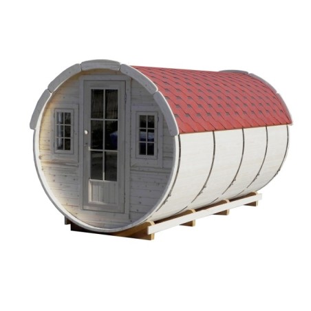 Stwórz wyjątkową przestrzeń noclegową z Beczką Sypialnianą Erik Ø 2,2 × 4,4 m — cylindryczną konstrukcji, która łączy rustykalną estetykę i funkcjonalność.
