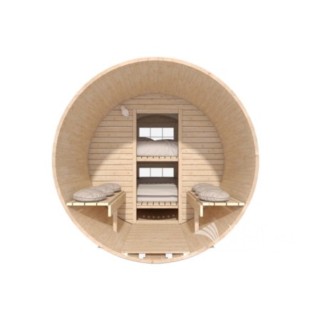 Beczka Sypialniana Nils Ø 2,2 × 4,4 m to powiększony wariant klasycznej beczki, zaprojektowany tak, aby pomieścić większą grupę bez kompromisów w wygodzie.